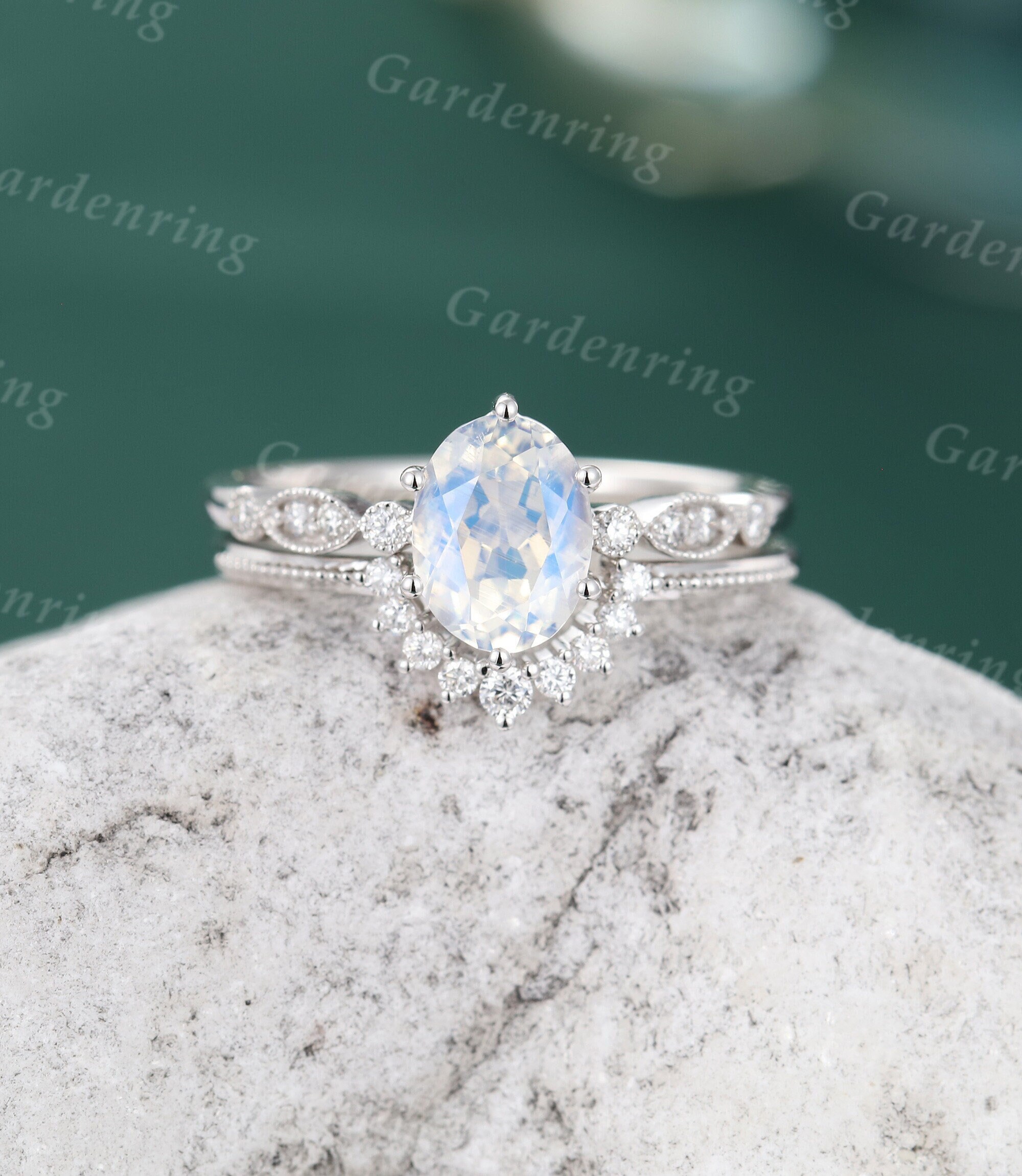 Moonstone Engagement Ring Set White Gold Vintage Unique Etsy